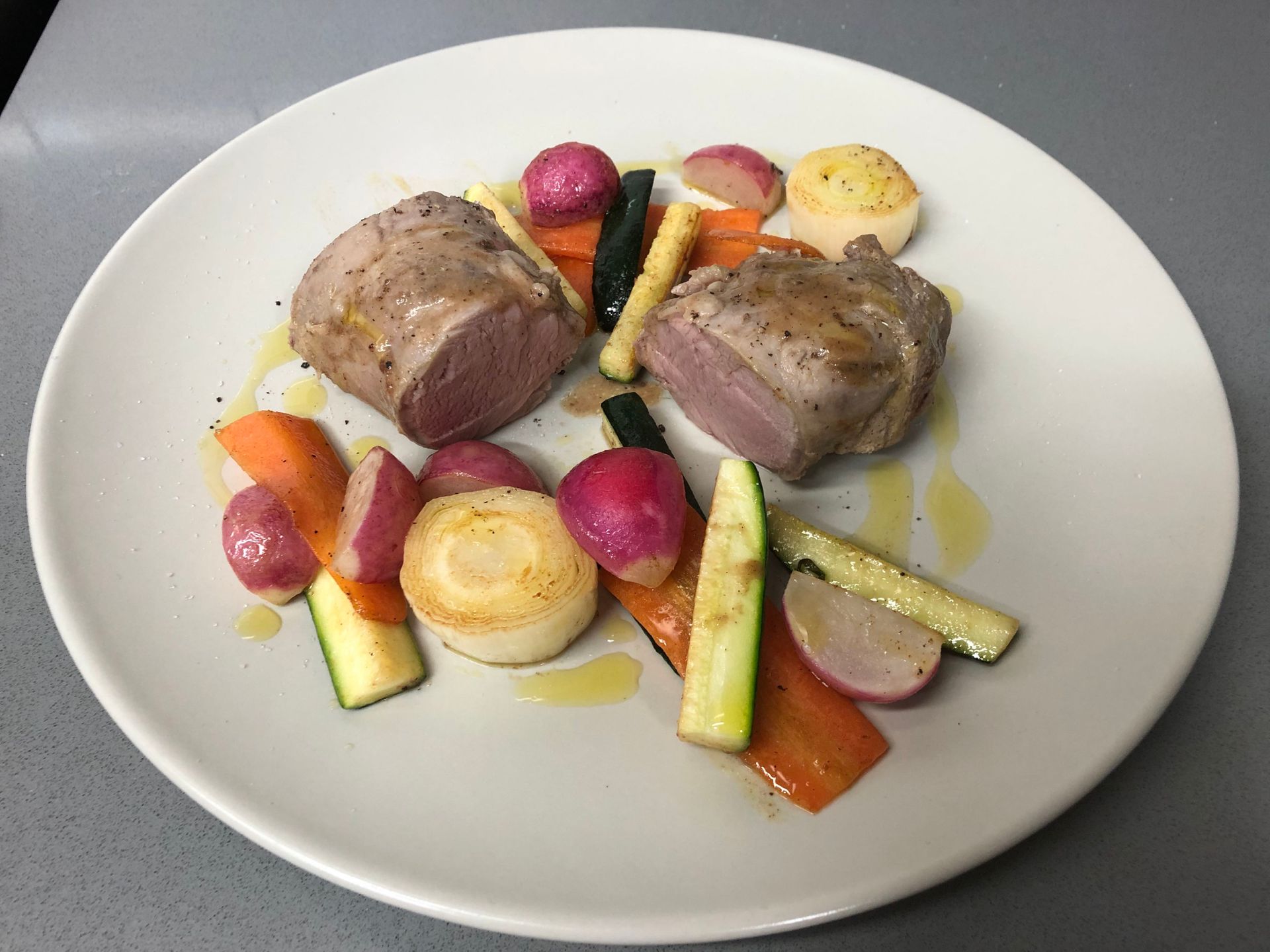 Coscia d’anatra confit con riduzione di vino rosso e verdure