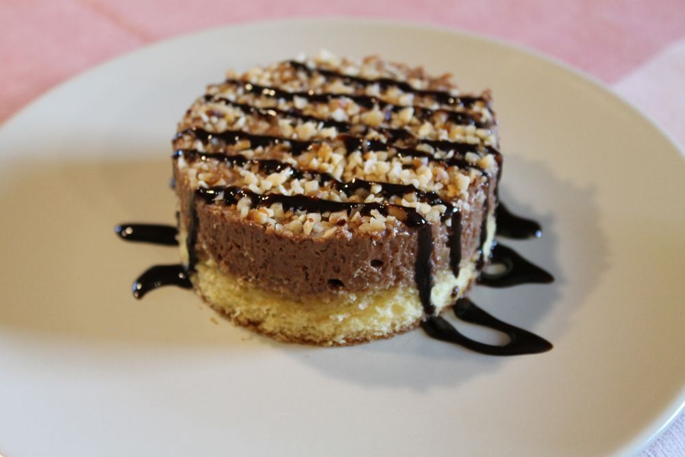 Cremoso al cioccolato, amaretti e nocciole su pan di spagna